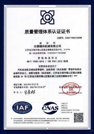 “ 以质量求生存,以管理增效益”是锡州机械坚定不渝的经营理念;“质量第一、客户至上”是锡州机械坚持不懈的追求;“ 以人为本,铸就优质产品, 精益求精,增强顾客满意”是锡州机械持之以恒的质量方针。 2001年7月公司通过ISO9001:2000质量体系认证, 2005年9月通过ISO/TS16949质量体系认证。公司于2007年7月通过产品ASME认证。 通过开展以产品质量为中心的企业管理,公司以先进的生产检测设备、完善的质量保证体系、严密的产品开发体系、严格按照标准开展产品生产管理,并开展6S现场管理,竭尽全力创造一个比较清洁、健康、安全的环境,全方位地满足国内外客户的要求。